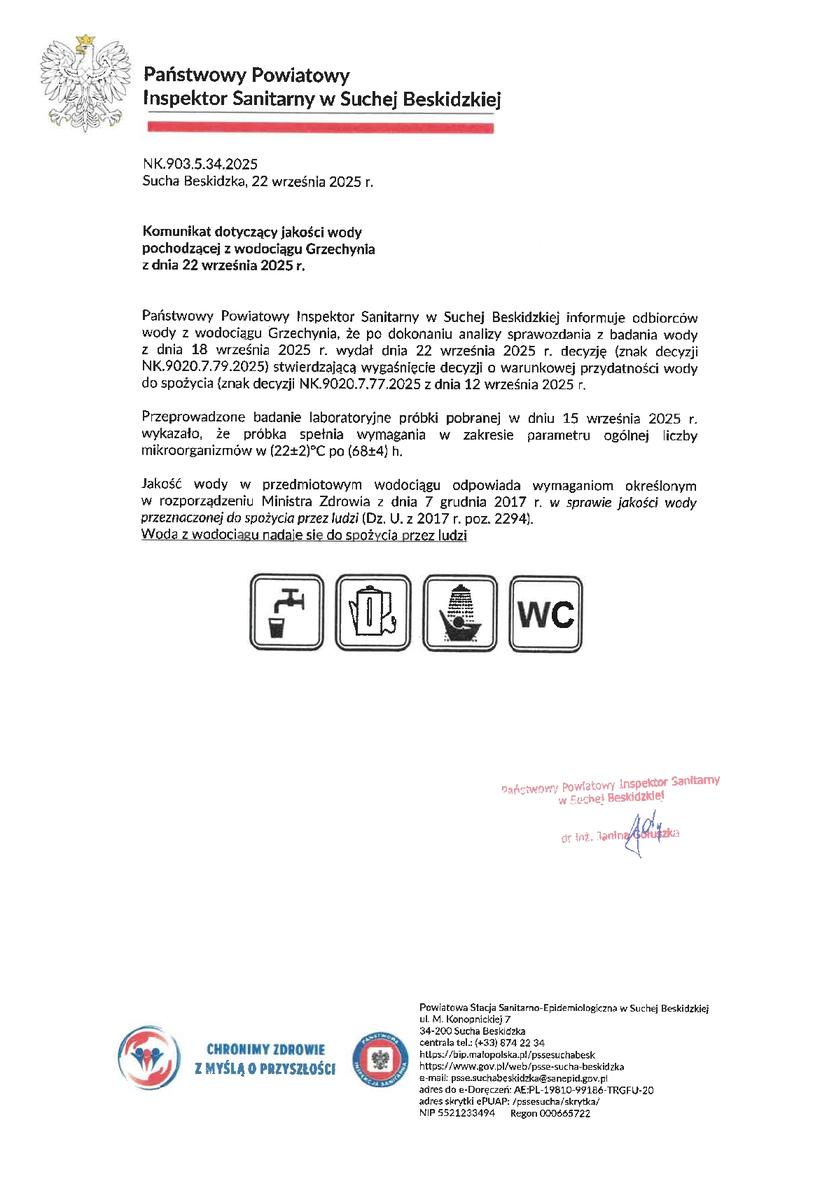 Przedsiębiorstwo Wodno-Kanalizacyjne "Eko-Skawa" Sp. z o.o. w Makowie Podhalańskim informuje odbiorców wody korzystających z wodociągu w Grzechyni, że po ponownych badaniach jakości wody przeznaczonej do spożycia przez ludzi spełnia wymagania dotyczące jakości wody do spożycia.